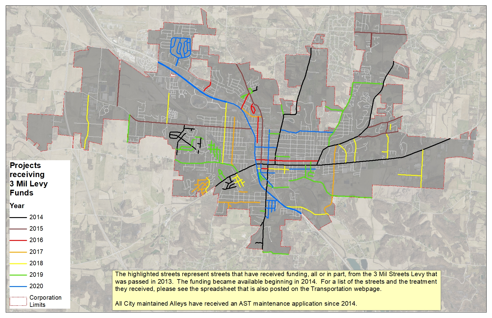 Paving streets is a big project and will take a number of years to finish. To track our progress click on our list of completed streets since 2014 or a map of our paving projects by year.